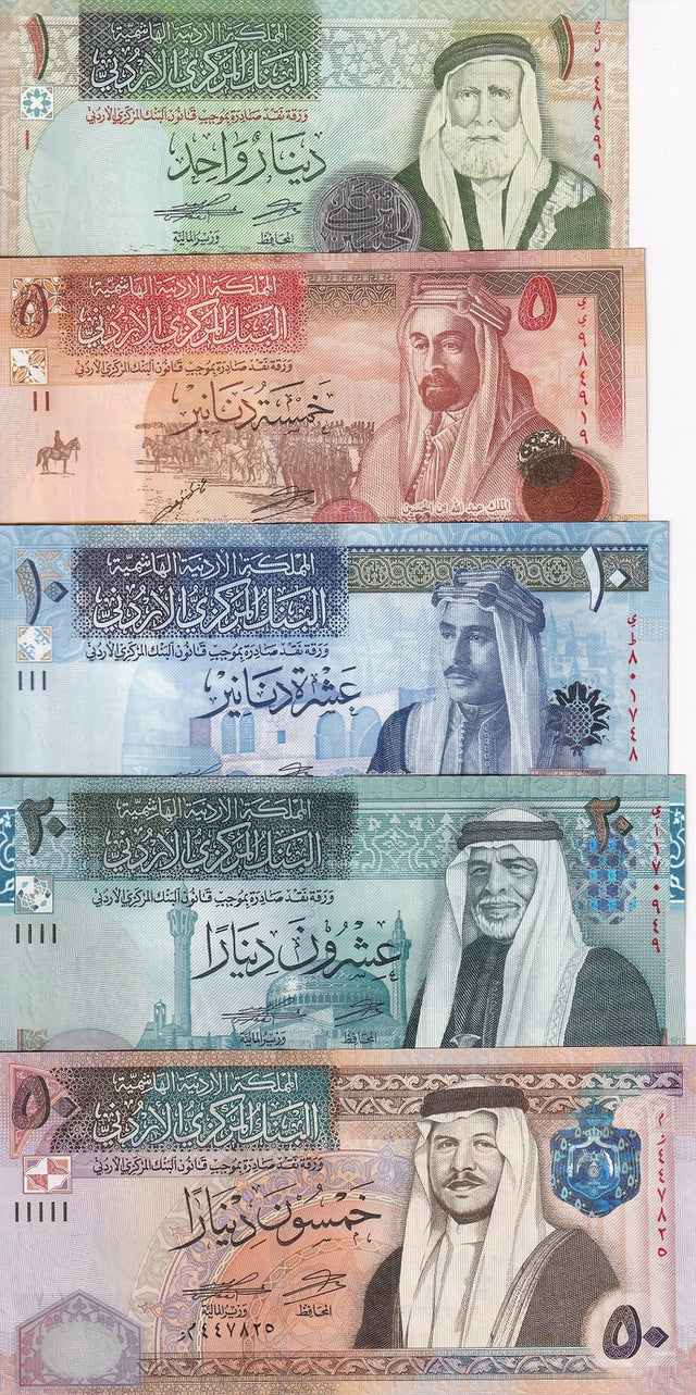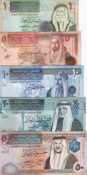 Jordan set 5 UNC 1 5 10 20 50 Dinars 2019-2021 P 34 35 36 37 38