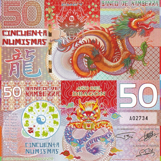 Kamberra 50 Numismas 2024 Chinese Zodiac Lunar Calendar Dragon Fantasy Polymer
