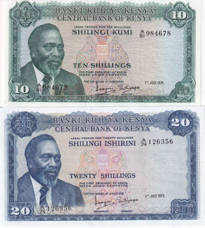 Kenya Set 2 PCS 10 20 Shillings 1973 1974 P 7 e P 8 d UNC