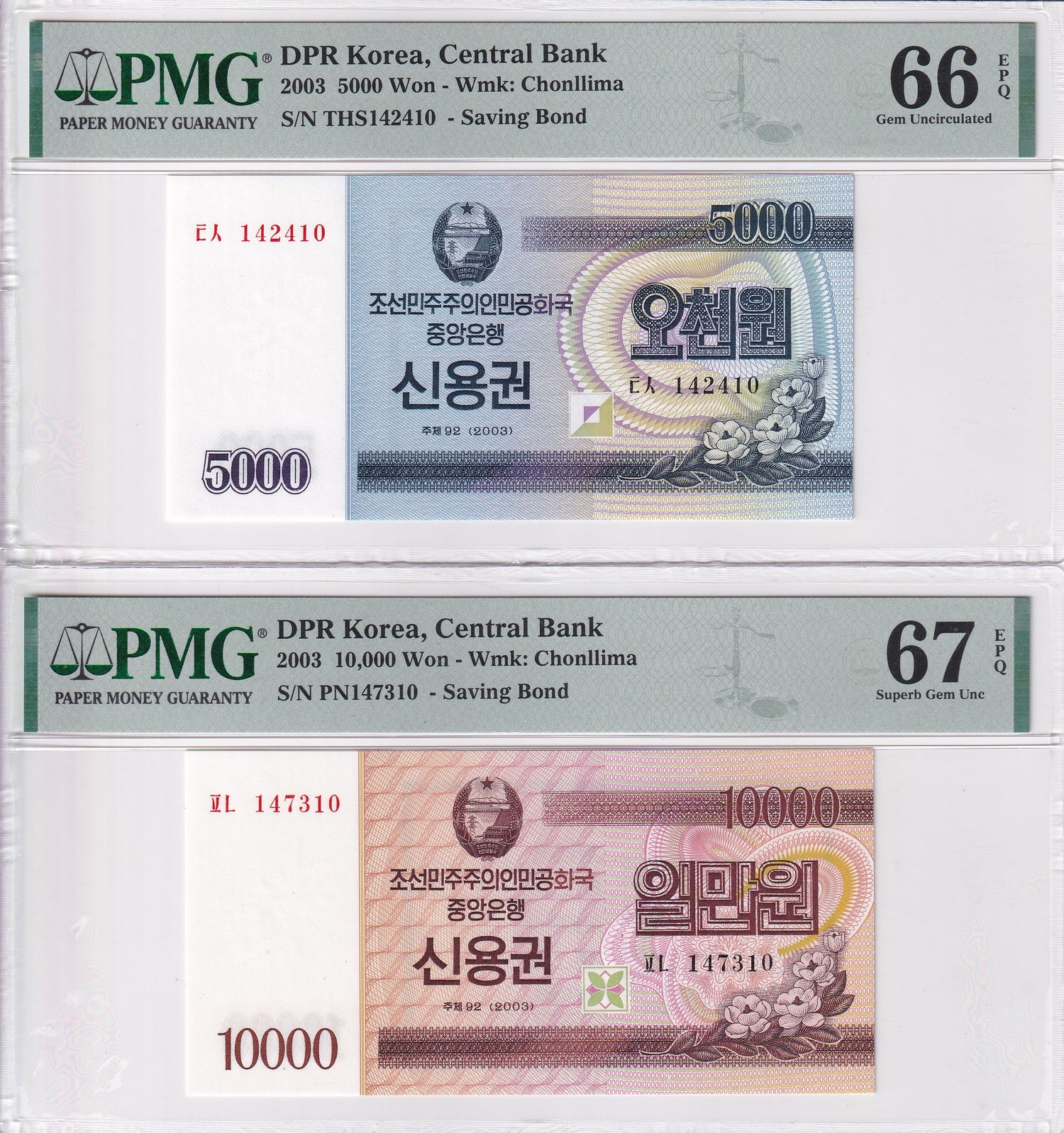 Korea SET 2, 5000 10000 Won 2003 Saving Bond Gem UNC PMG 66 EPQ