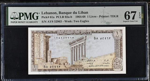 Lebanon 1 Livres 1968 P 61 a Superb Gem UNC PMG 67 EPQ