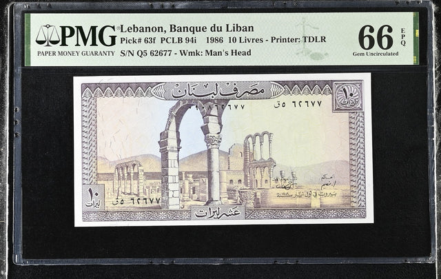 Lebanon 10 Livres 1986 P 63 f Gem UNC PMG 66 EPQ