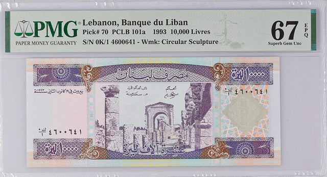 Lebanon 10000 Livres 1993 P 70 0K/1 Superb Gem UNC PMG 67 EPQ