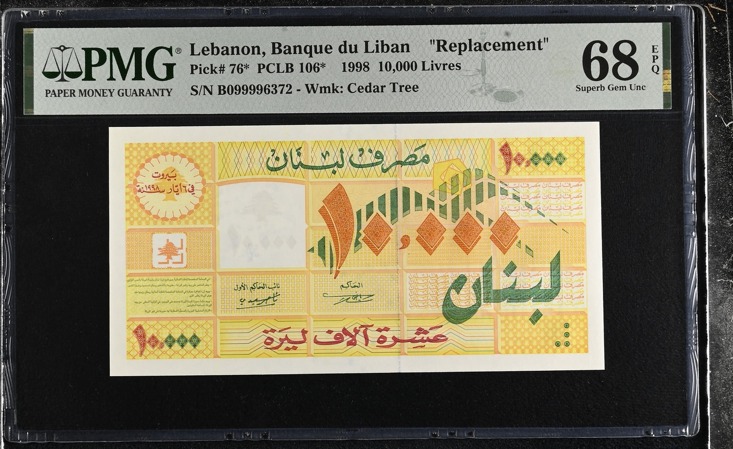 Lebanon 10000 Livres 1998 P 76* Replacement Superb Gem UNC PMG 68 EPQ