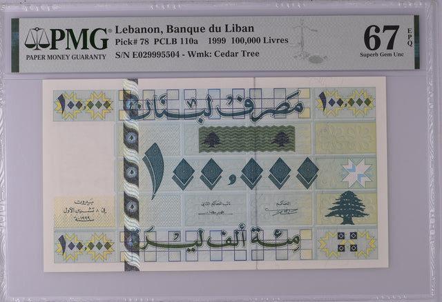 Lebanon 100000 Livres 1999 P 78 Superb Gem UNC PMG 67 EPQ
