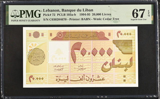 Lebanon 20000 Livres 1995 P 72 Superb Gem UNC PMG 67 EPQ