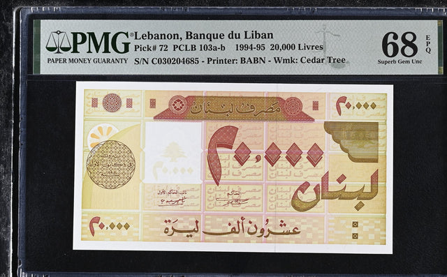 Lebanon 20000 Livres 1995 P 72 Superb Gem UNC PMG 68 EPQ TOP POP