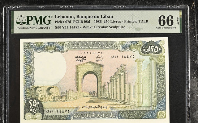Lebanon 250 Livres 1986 P 67 d Gem UNC PMG 66 EPQ