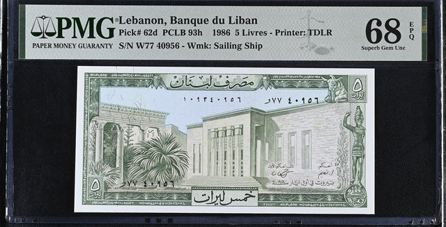 Lebanon 5 Livres 1986 P 62 d Superb Gem UNC PMG 68 EPQ