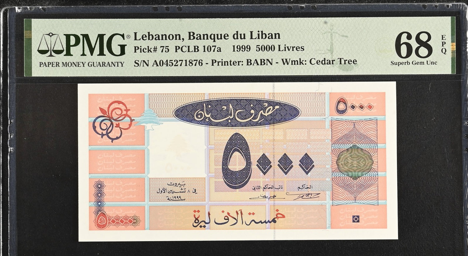 Lebanon 5000 Livres 1999 P 75 Superb Gem UNC PMG 68 EPQ