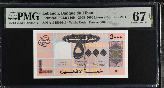 Lebanon 5000 Livres 2008 P 85 b Superb Gem UNC PMG 67 EPQ