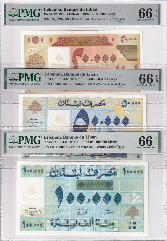 Lebanon Set 3; 20000 50000 100000 Livres 1995 P 72 73 74 Gem UNC PMG 66 EPQ