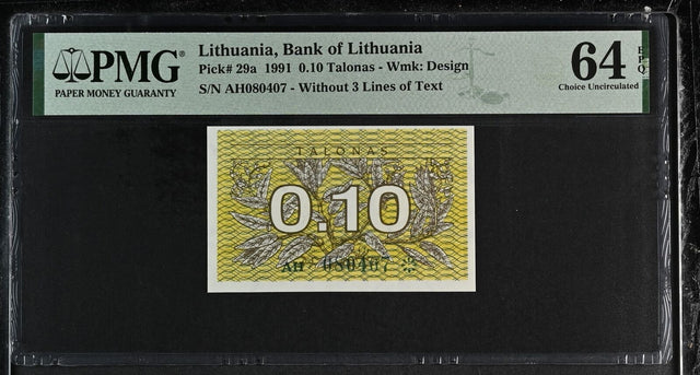 LITHUANIA 0.1 TOLONAS 1991 P 29 a Choice UNC PMG 64 EPQ
