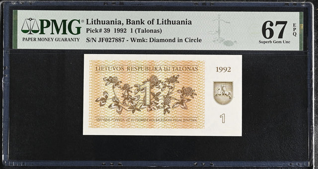 Lithuania 1 Talonu 1992 P 39 Superb Gem UNC PMG 67 EPQ