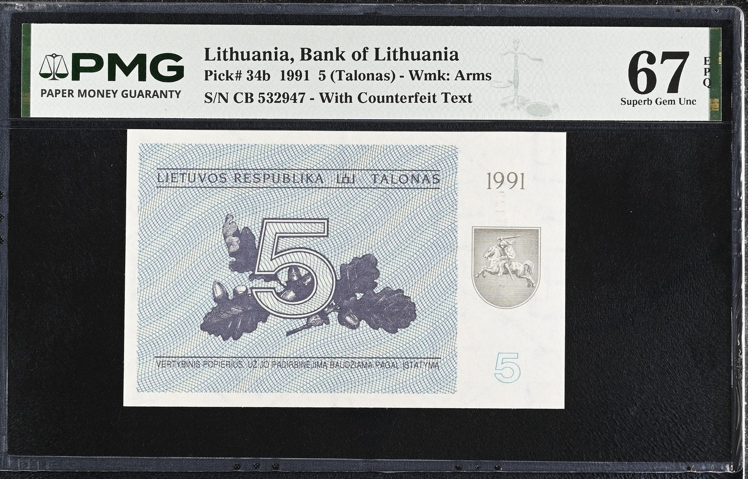 Lithuania 5 Talonas 1991 P 34 b Superb Gem UNC PMG 67 EPQ