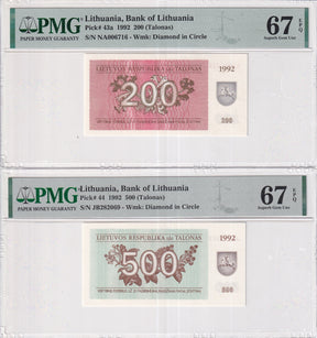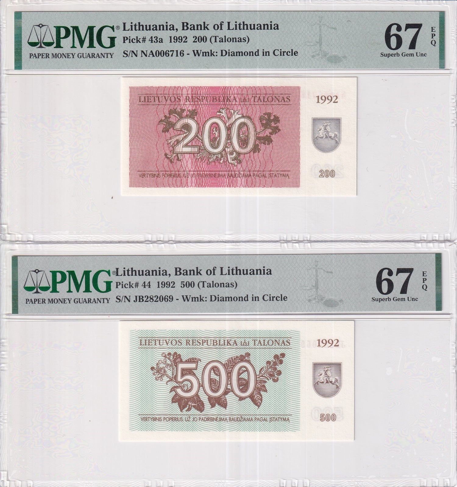 Lithuania Set 2; 200 500 Talonas 1992 P 43 P 44 Superb Gem UNC PMG 67 EPQ