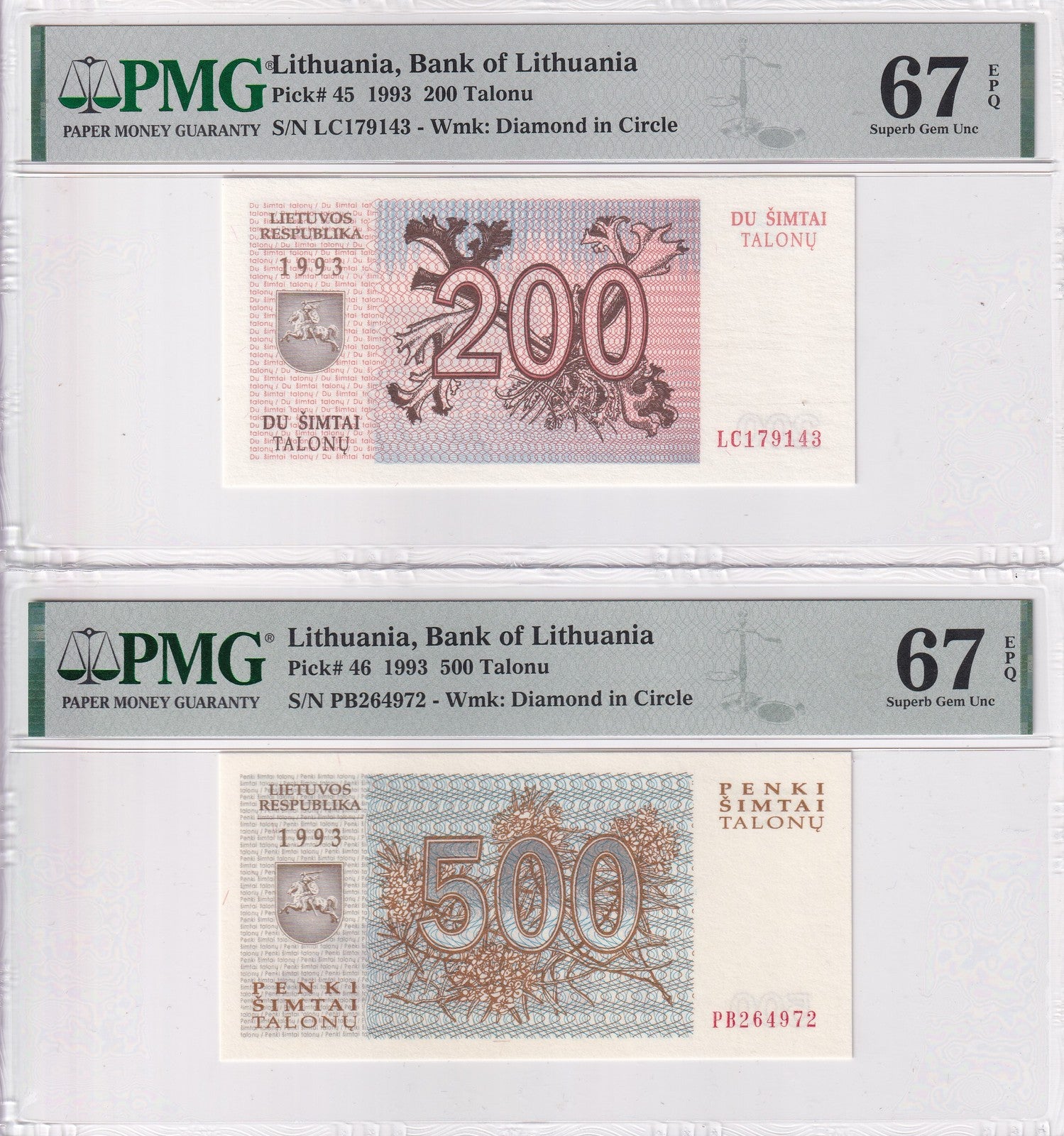 Lithuania Set 2; 200 500 Talonu 1993 P 45 P 46 Superb Gem UNC PMG 67 EPQ