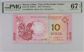 Macau 10 Patacas 2013 P 86 Snake Comm. Superb Gem UNC PMG 67 EPQ