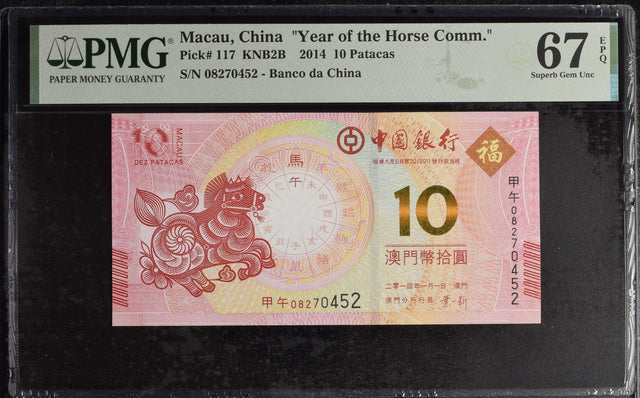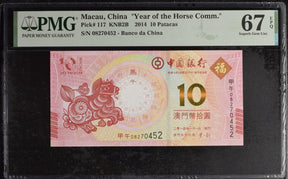 Macau 10 Patacas 2014 P 117 Horse BOC Commemorative Superb Gem UNC PMG 67 EPQ