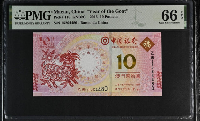 Macau 10 Patacas 2015 P 118 Goat BOC Gem UNC PMG 66 EPQ
