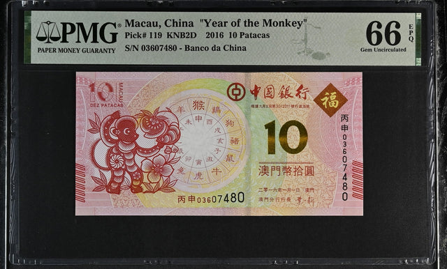 Macau 10 Patacas 2016 P 119 Monkey BOC Commemorative Gem UNC PMG 66 EPQ