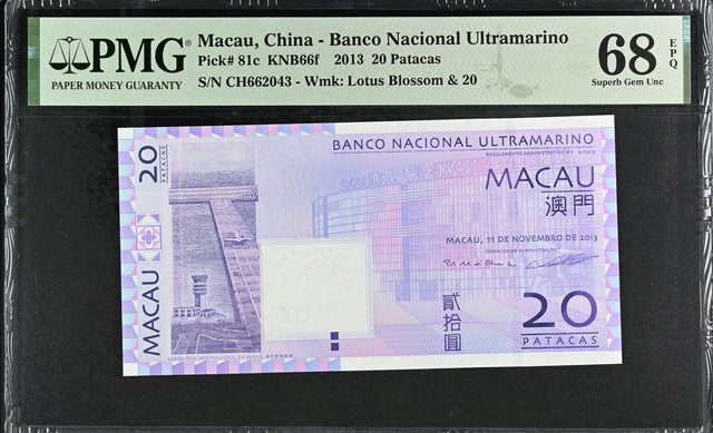 Macau 20 Patacas 2013 P 81 c BNU Superb Gem UNC PMG 68 EPQ
