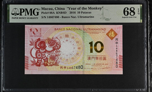Macau Macao 10 Patacas 2016 P 88A MONKEY BNU Superb Gem UNC PMG 68 EPQ