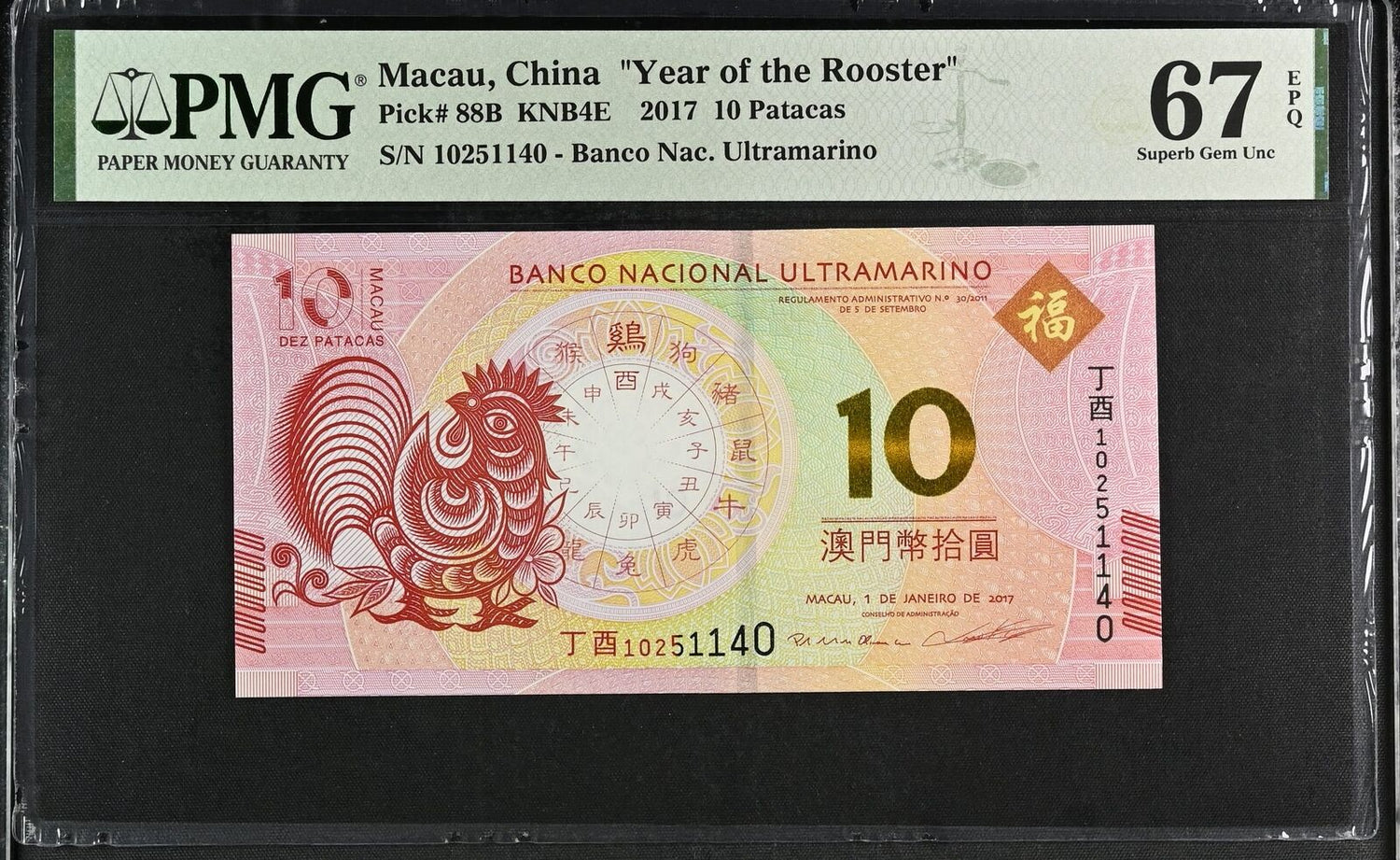 Macau Macao 10 Patacas 2017 P 88B Rooster Superb Gem UNC PMG 67 EPQ