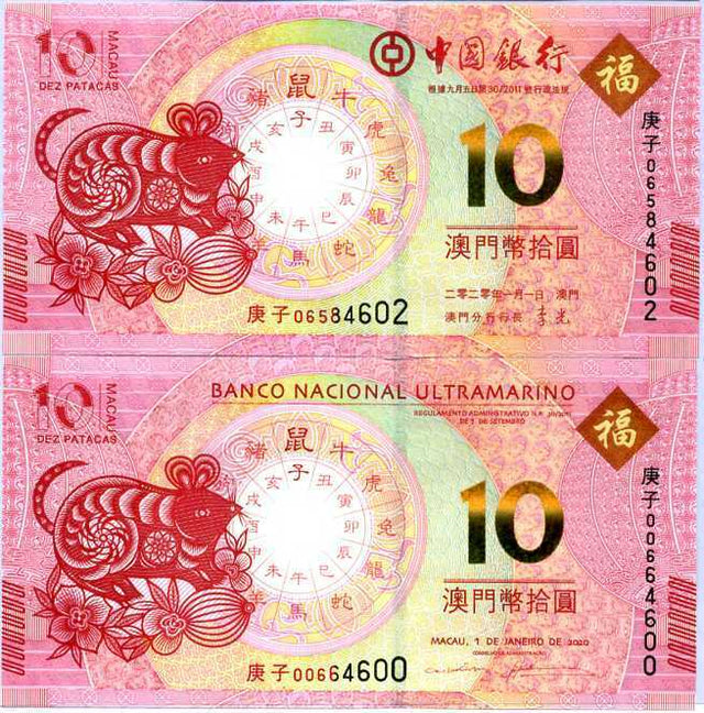 Macau Set 2 Pcs 10 Patacas 2020 Mouse (Rat) Year 2021 BNU & BOC P 88E 122A UNC