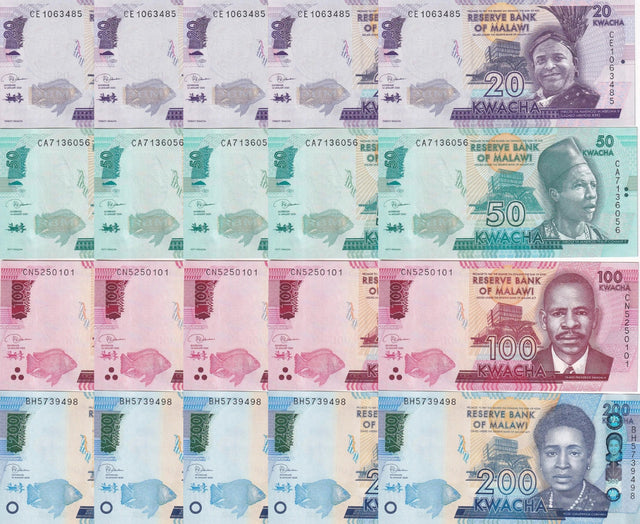 Malawi Set 4 Pcs 20 50 100 200 Kwacha Random Date P 60-65 UNC Lot 5 = 20 Pcs