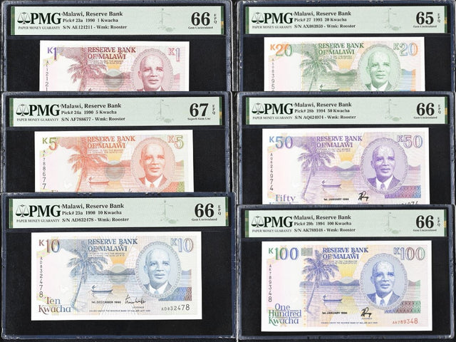 Malawi SET 6 1 5 10 20 50 100 Kwacha 1990-1994 P 23 -28 29 Gem UNC PMG 66 67 EPQ