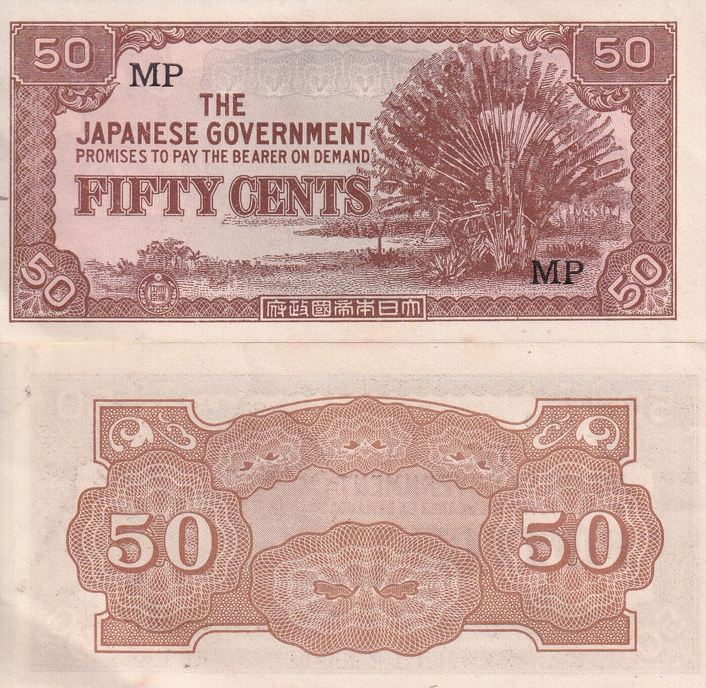 MALAYA 50 CENTS JAPANESE OCCUPATION P M4 "MP" AUnc Little Yellow Tone