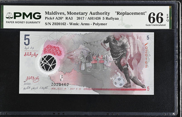 Maldives 5 Rufiyaa 2017 P A26* Replacement Polymer Gem UNC PMG 66 EPQ