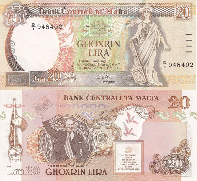 Malta 20 Liri L1967 ND 1989 P 44 UNC