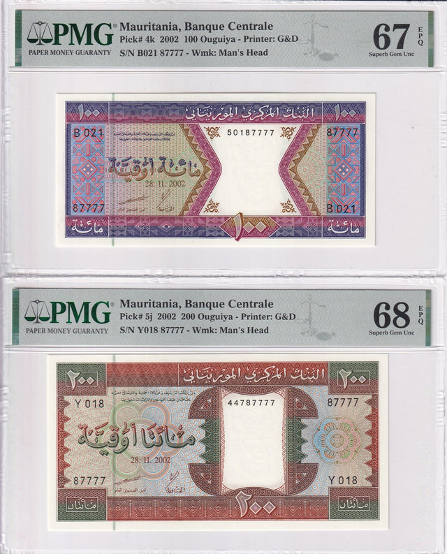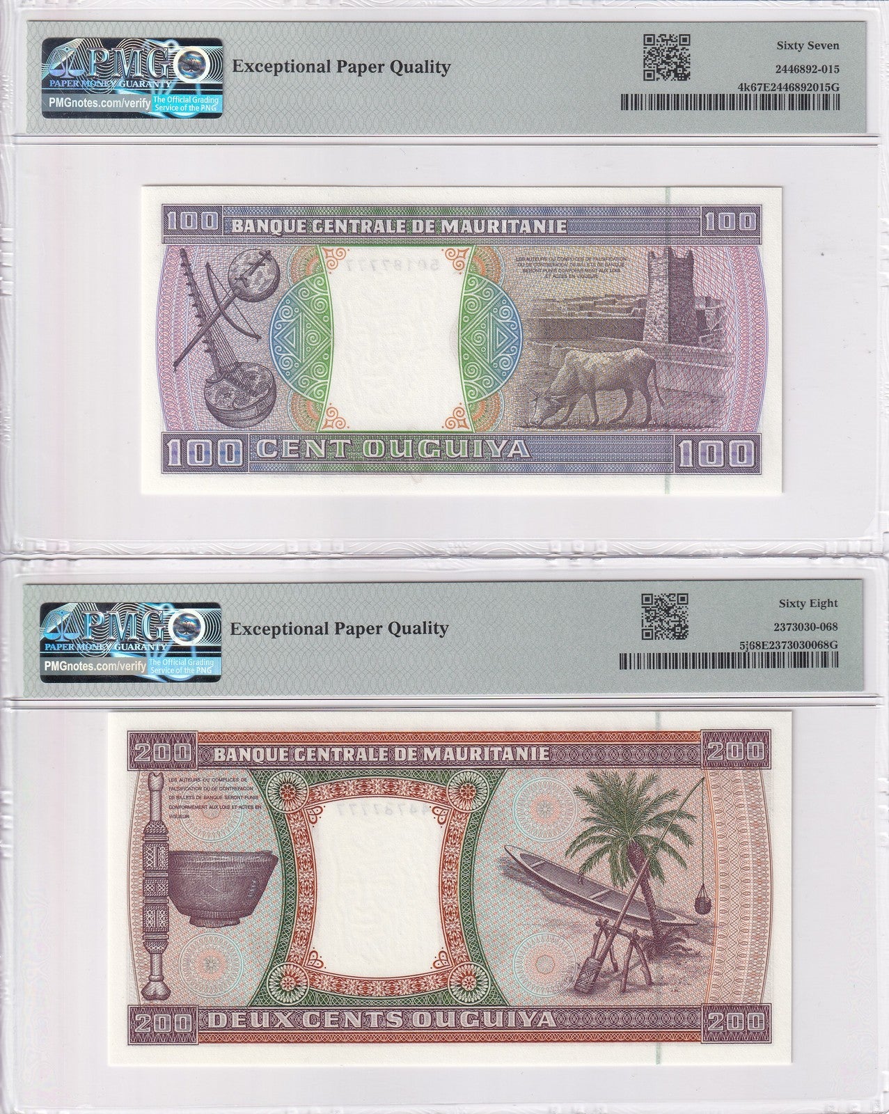 Mauritania Set 2; 100 200 Ouguiya 2002 P 4 P 5 Superb Gem UNC PMG 67 68 EPQ