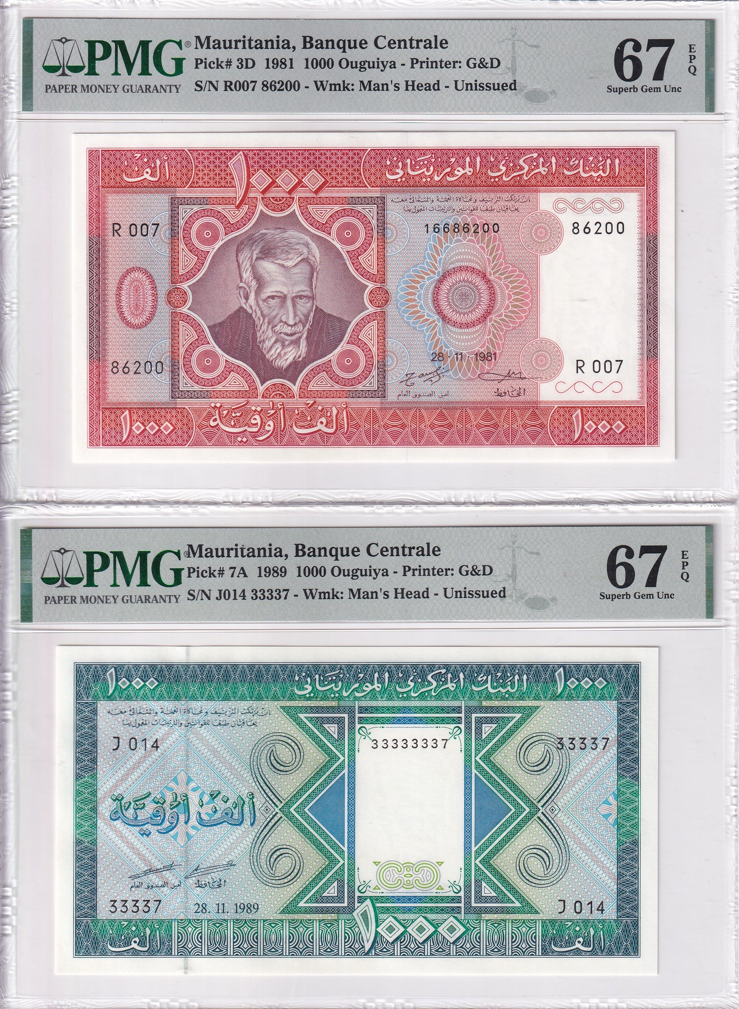 Mauritania SET 2;1000 Ouguiya 1981 1989 P 3D P 7A Superb Gem UNC PMG 67 EPQ