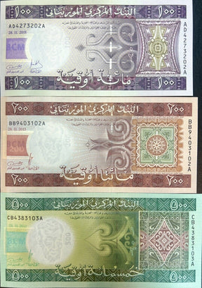 Mauritania Set 3 Pcs 100 200 500 Ouguiya 2013-2015 Hybrid P 16 17 18 UNC