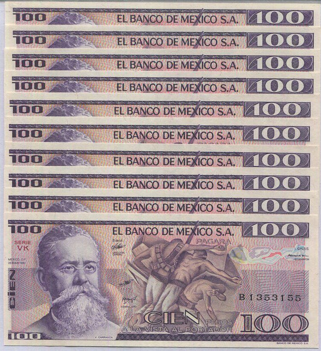 Mexico 100 Pesos 1982 P 74 AUnc lot 10 PCS