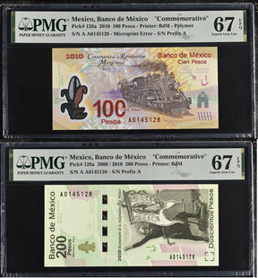 Mexico SET 2 200 Pesos 2008/2010 Comm. P 128 129 AA Superb Gem UNC PMG 67 EPQ