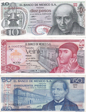 Mexico set 3 Pcs 10 20 50 Pesos Random Year P 63 P 64 P 67 UNC
