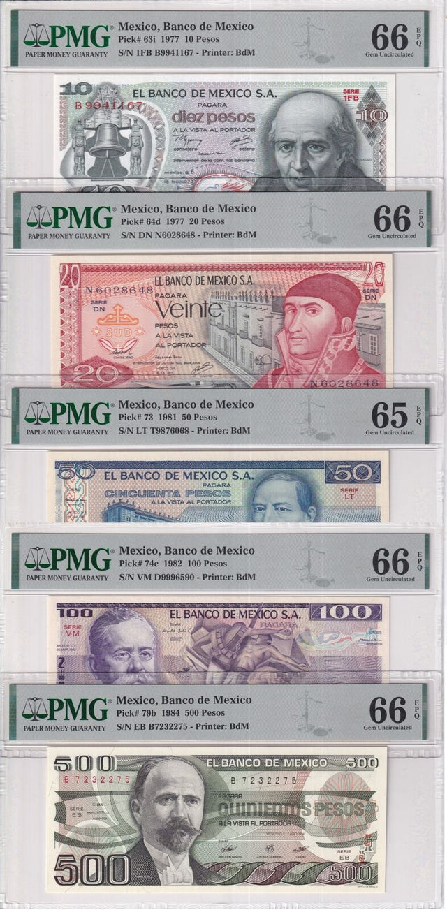 Mexico SET 5 PCS 10 20 50 100 500 Pesos 1977-84 P 63 64-79 Gem UNC PMG 65 66 EPQ