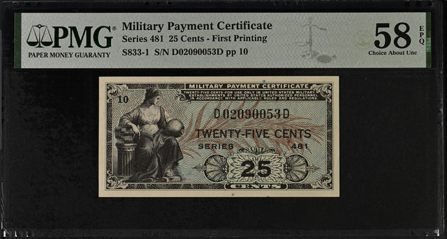 Military Payment Certificate 25 Cents MPC USA Series 481 Choice UNC PMG 58 EPQ