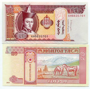 This MONGOLIA 20 TUKRIK 2013 P 63 g UNC Banknote provides value to your collection with its unique design and collectible appeal. This UNC note weighs 63g and is an impressive addition to any collection.