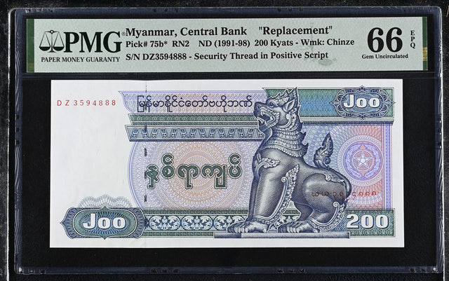 Myanmar 200 Kyats ND 1991-1998 P 75 b* Replacement Gem UNC PMG 66 EPQ TOP POP