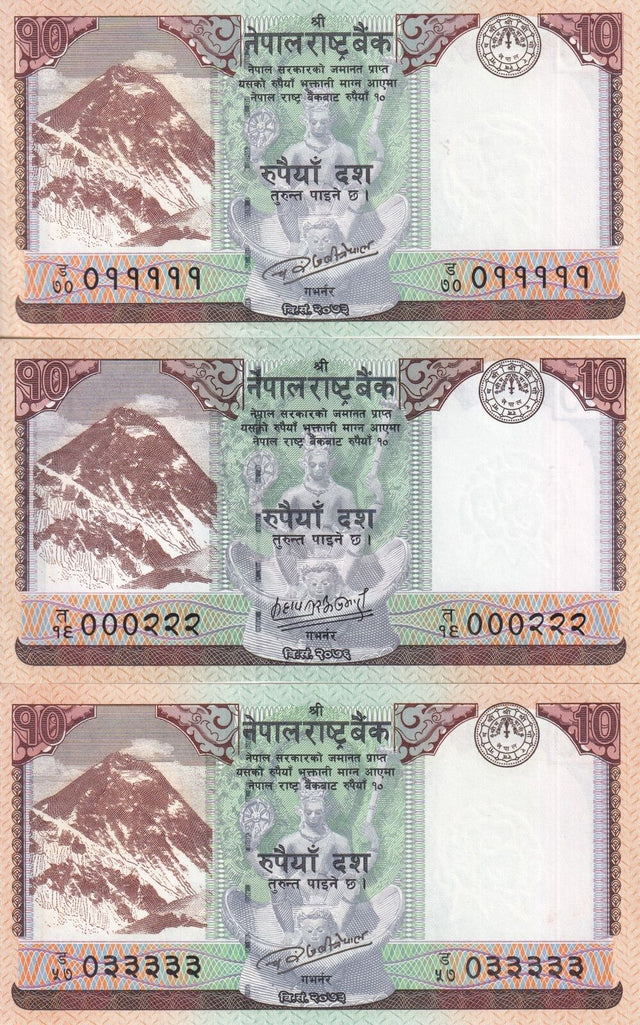 Nepal SET 3 UNC 10 Rupees 2017 P 77 Nice solid Number 11111, 222, 33333