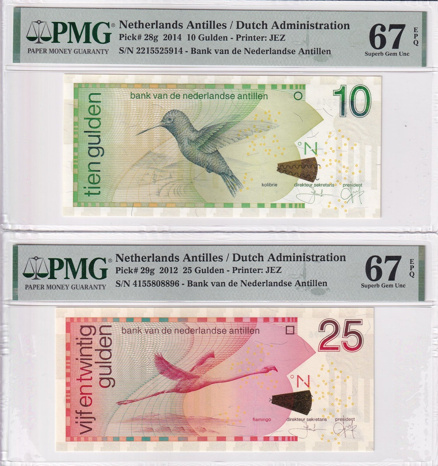 Netherlands Antilles Set 2;10 25 Gulden 2012 2014 P 29 Superb Gem UNC PMG 67 EPQ