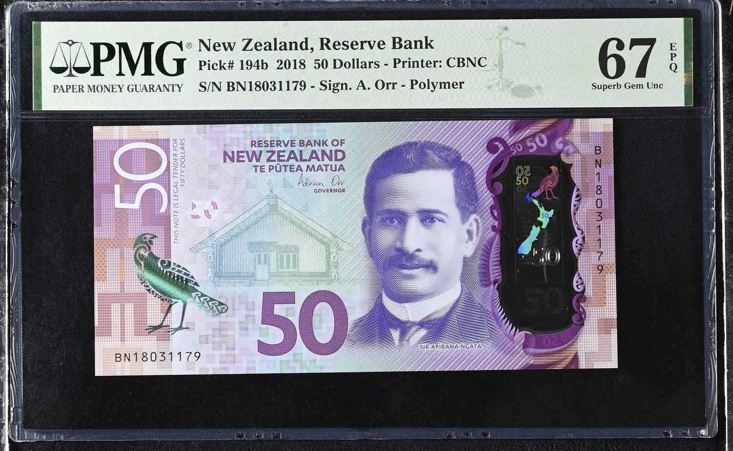 New Zealand 50 Dollars 2018 Polymer P 194 b Superb Gem UNC PMG 67 EPQ