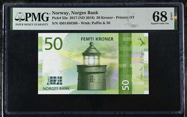 Norway 50 Kroner 2017 ND 2018 P 53 a Superb Gem UNC PMG 68 EPQ