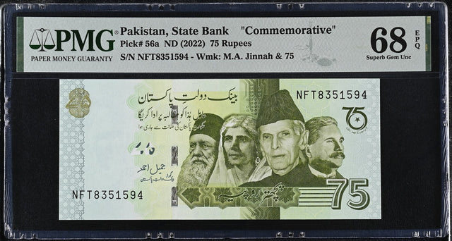 Pakistan 75 Rupees ND 2022 P 56 a Commemorative Superb Gem UNC PMG 68 EPQ
