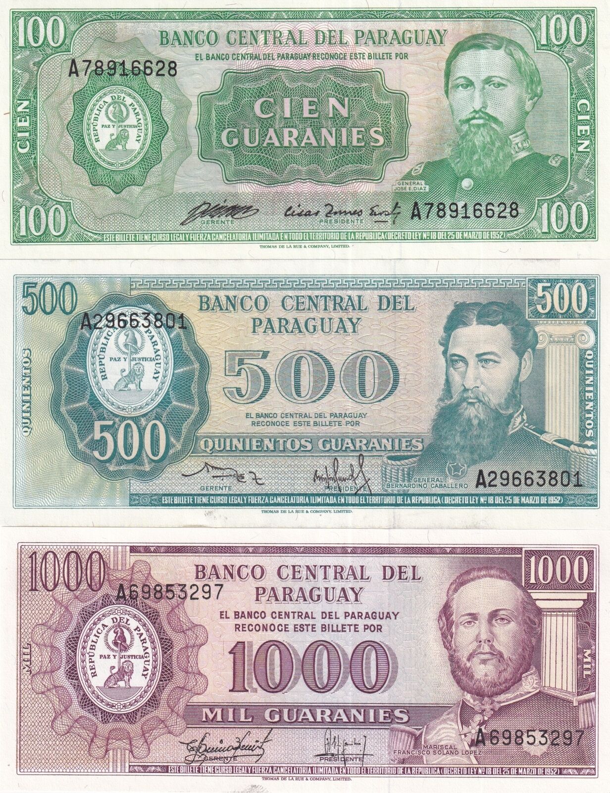 Paraguay Set 3 PCS 100 500 1000 Guaranies 1982 P 205 206 207 UNC